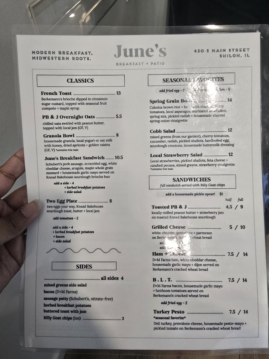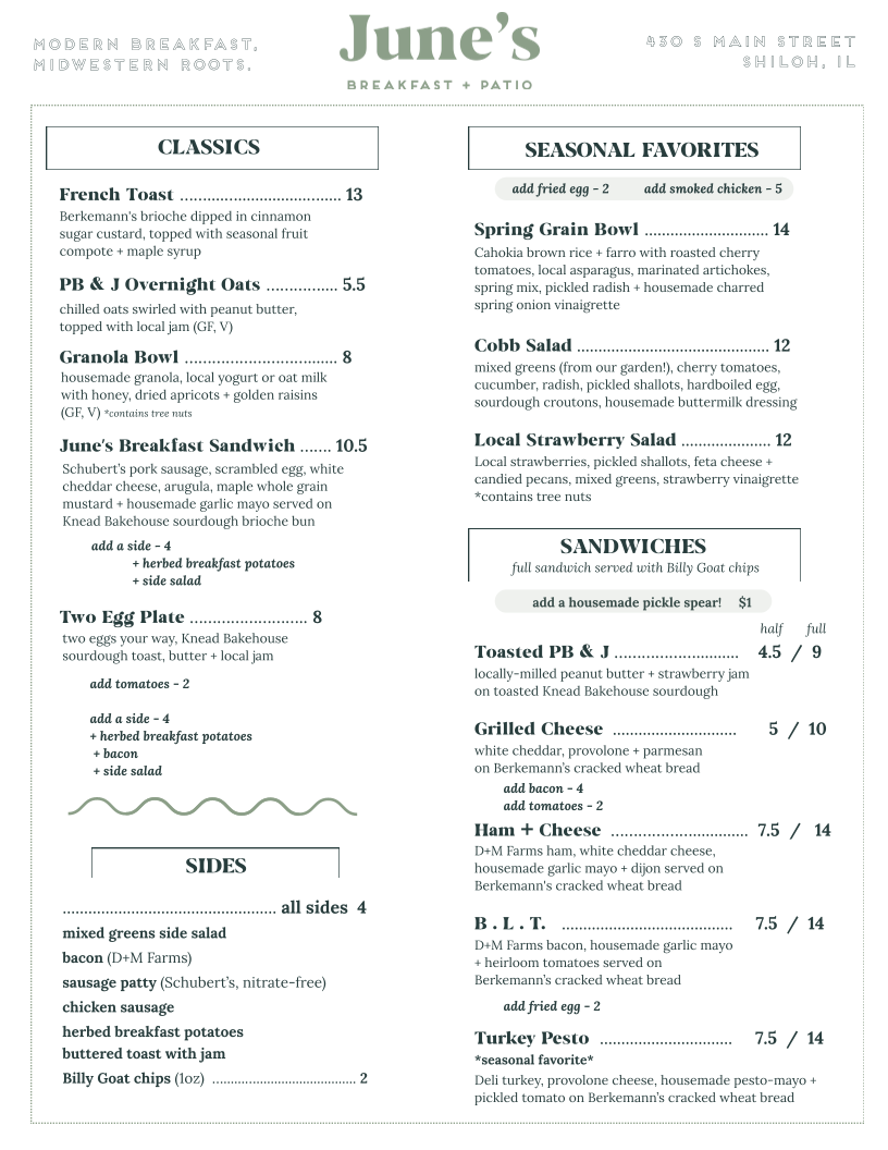 If you’re in the mood for a cozy and delicious breakfast experience, look no further than June's Breakfast Patio Menu. Nestled at 430 S Main St in Shiloh, IL, this charming spot offers a delightful variety of breakfast options that will make your morning feel extra special. From freshly brewed coffee to perfectly scrambled eggs, the menu is filled with mouthwatering choices that cater to all tastes.